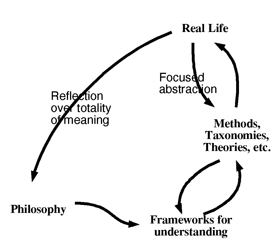 If we are to make headway, we need to understand the diverse types of failure, to articulate more useful concepts, to discern the causes of failure, to obtain more precise measures, and to generate useful design principles that reduce failure. But, most of all, to ensure that these objectives do not conflict with each other, we need to find one coherent framework for understanding I.S. development and use on which all these can be based. Frameworks for understanding an issue come from philosophy and the assumptions inherent therein, whether the philosophy is explicit or tacit. See Fig. 1.