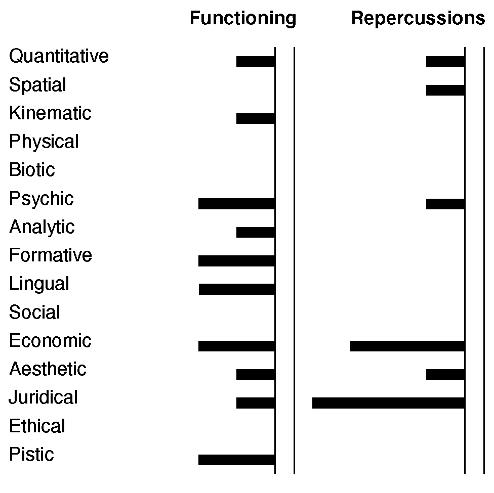 The meaning of a single aspect is quite broad; for example the formative aspect covers culture, history, technology, creativity, achievement of goals, planning, formulation of artifacts, formulation of ideas, methodology, technique, and so on - everything in which human formation (whether of physical, conceptual or social things) is central. (The reader does not need to understand all aspects; the text below will explain what is needed.)